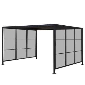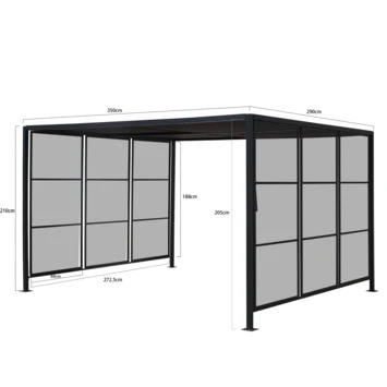 Het paviljoen beschikt over een schuifbaar dak een zonwerend doek, hiermee kun je schaduw creëren waar je maar wilt. Deze tuinpaviljoen is voorzien van een stevig staal gecoat frame met poten van 5×5 cm. De nokhoogte is 210 cm.