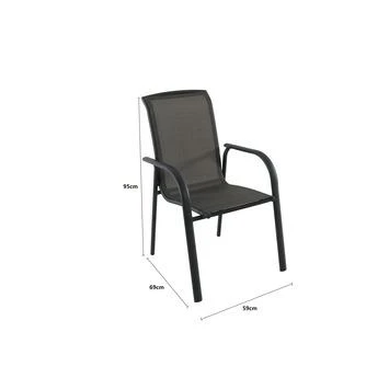 De stapelstoel is 95 centimeter hoog, 59 centimeter breed en 69 centimeter diep.