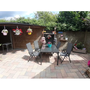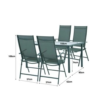 Met de Tuinset Nantes ben je direct voorzien van een complete set, om er zomers intensief gebruik van te maken. De Tuinset Nantes bestaat uit een tafel met glazen blad en stalen frame (150×90 cm) plus 4 standenstoelen met een textileen zitting. De stoelen zijn te verstellen in 3 verschillende standen en inklapbaar, waardoor deze gemakkelijk op te bergen zijn. De set is zeer onderhoudsvriendelijk en weerbestendig. Kortom, met deze luxe buitenset ben je verzekerd van comfort!